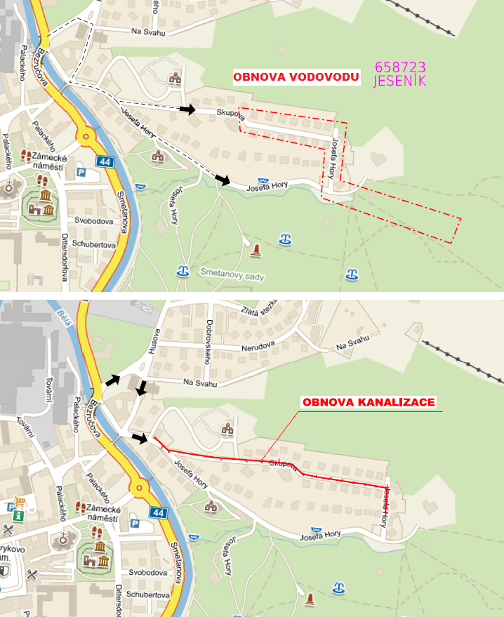 OBNOVA VODOVODU A KANALIZACE V ULICI SKUPOVA, JESENÍK (STAVBA DOKONČENA)Dne 31. 7. 2017 bude zahájena výše uvedená stavba. Jedná se o obnovu vodovodu v délce 510 m a obnovu kanalizace v délce 535 m v ulici Skupova v k.ú. Jeseník s celkovými náklady cca 9,0 mil. Kč. Stavba bude dokončena v červnu příštího roku. Předpoklad dopravního omezení v ulici Skupova je do 11/2017. Předmětem stavby je obnova stávajícího vodovodního řadu z oceli DN 80, který byl uveden do provozu v roce 1967. Dále bude obnovena také kanalizace (beton DN 400 a 300), která byla uvedena do provozu v roce 1975. Obnova vodovodu bude vedena částečně v trase původního vodovodu a částečně v nové trase (v místní komunikaci). V místní komunikaci bude vodovod proveden otevřeným výkopem společně s kanalizací. Samostatná trasa vodovodu bude provedena převážně bezvýkopovou technologií. Součástí obnovy vodovodu je také obnova vodojemu Horova. Součástí obnovy je také přepojení vodovodních přípojek. V tomto odkazu je ke stažení katastrální situace obnovy vodovodu. Obnova stávající kanalizační stoky z betonu DN 300 a DN 400 bude provedena otevřeným výkopem. Součástí obnovy je také přepojení kanalizačních přípojek. V tomto odkazu je ke stažení katastrální situace obnovy vodovodu. Po provedení obnovy vodovodu a kanalizace bude také provedena rekonstrukce dešťových vpustí a následně rekonstrukce plynovodu (innogy). Místní komunikace bude v celé šíři opravena, a to včetně obrubníků. Tato stavba bude prováděna ve vzájemné koordinaci VAK, města Jeseník a innogy. Komplexně obnovená infrastruktura bude pro danou lokalitu významným přínosem a zajistí na několik desetiletí bezproblémový provoz bez omezení, a to jak vlastní VHI, tak místní komunikace. Za omezení provozu a případné komplikace se velmi omlouváme a děkujeme za pochopení.
