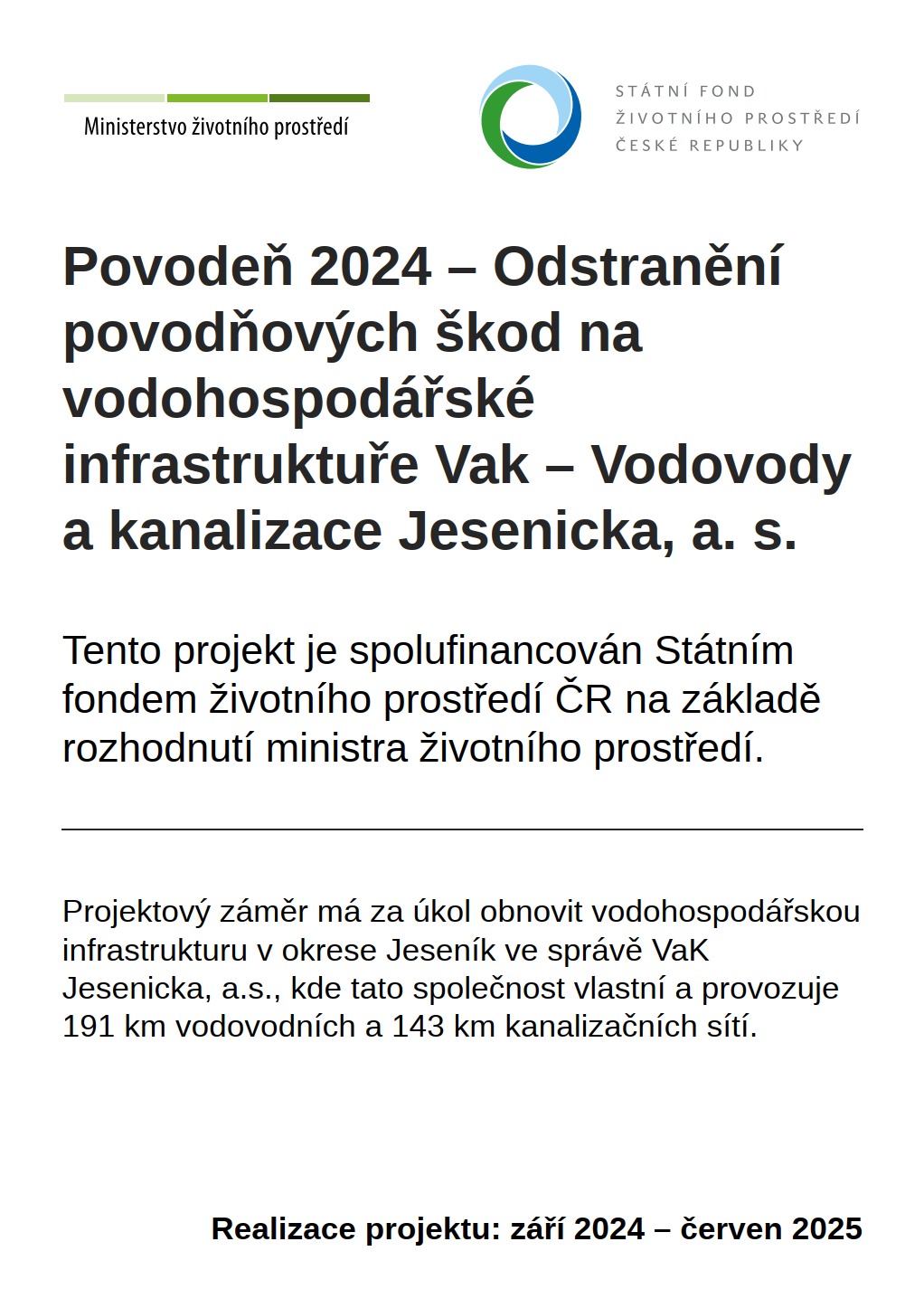 POVODEŇ 2024 – ODSTRANĚNÍ POVODŇOVÝCH ŠKOD NA VODOHOSPODÁŘSKÉ INFRASTRUKTUŘE VAK – VODOVODY A KANALIZACE JESENICKA, A. S.V polovině září 2024 postihly oblast Jesenicka extrémní srážky, které během několika málo hodin přerostly v ničivou povodeň s mimořádně vážnými důsledky pro obyvatele i infrastrukturu celého regionu. Český hydrometeorologický ústav označil tento jev za jednu z nejintenzivnějších hydrologických událostí za posledních několik desítek let. Extrémně vydatné deště, spojené s rychlým odtokem povrchových vod z hornatého terénu, způsobily rychlé rozvodnění vodních toků a následné lokální záplavy. Poškození se dotklo všech základních prvků infrastruktury. Kritickým zásahem bylo zničení dvou jímacích objektů surové vody včetně přístupových komunikací – tyto objekty představovaly důležité body pro zásobování Úpravny vody Adolfovice. Mimo provoz byla rovněž ČOV Česká Ves a sedm čerpacích stanic odpadních vod, což mělo přímý dopad na odvádění splaškových vod z dotčených oblastí. Využili jsme výzvu „Obnova infrastruktury pro životní prostředí“ vyhlášenou Ministerstvem životního prostředí (MŽP), prostřednictvím Státního fondu životního prostředí (SFŽP) a která umožnila pokrytí 100 % způsobilých nákladů. Žádost o podporu ve výši 262,6 milionu Kč byla podána 11. října 2024 a finanční prostředky byly připsány na účet společnosti 12. listopadu 2024. Tyto finance se staly klíčovým pilířem pro okamžité zahájení oprav a rekonstrukcí, což umožnilo rychlou obnovu a stabilizaci vodohospodářských služeb v regionu. INFORMACE STAVBY A KONTAKTY